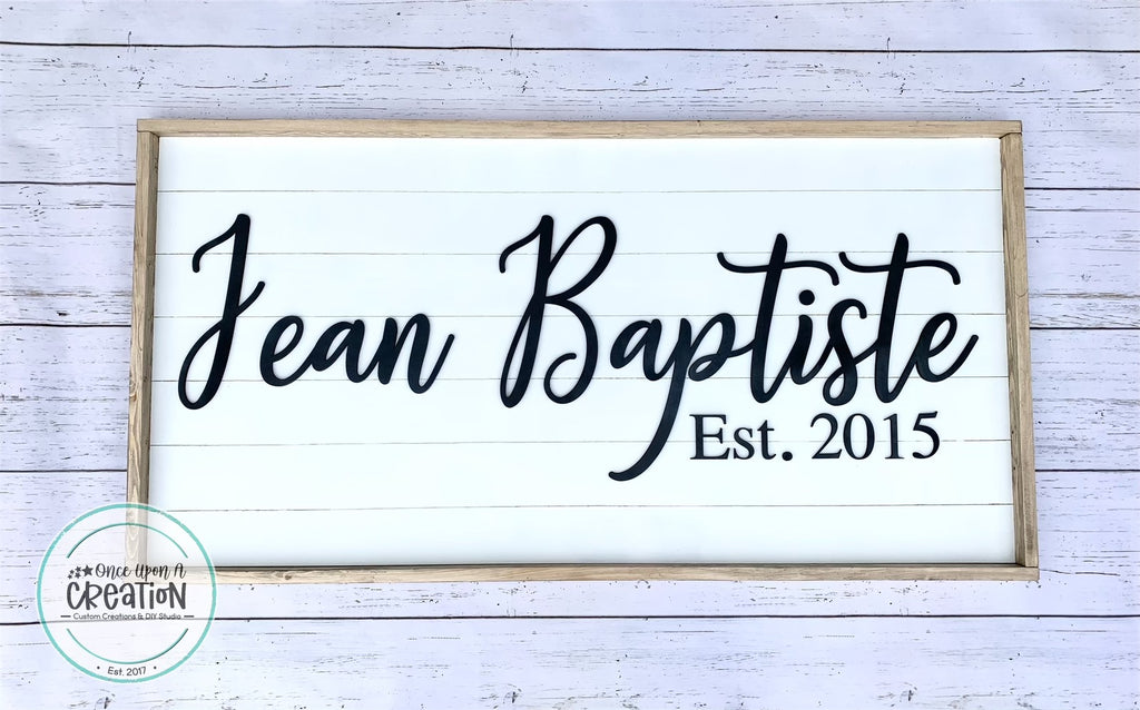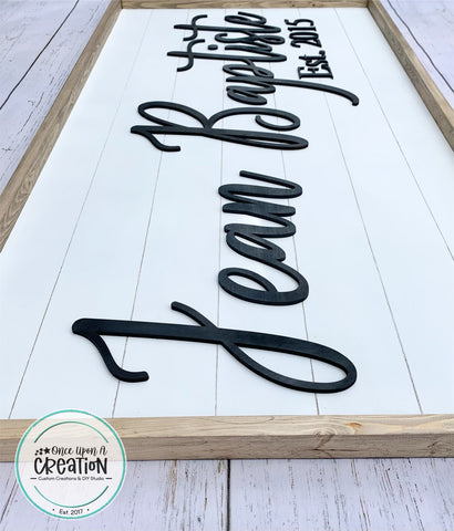 Beautifully display your last name and established year with this shiplap style sign, featuring 3D wood. Can be purchased in three different sizes: 12" x 24", 16" x 32" or 16" x 50"