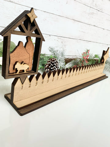 This stunning sign helps you countdown to Christmas in a fun and beautiful way! It is 18 1/2" long and 8 1/2" tall and is freestanding. Choose between the Star, Manger Scene or Joseph & Mary for your moveable piece.